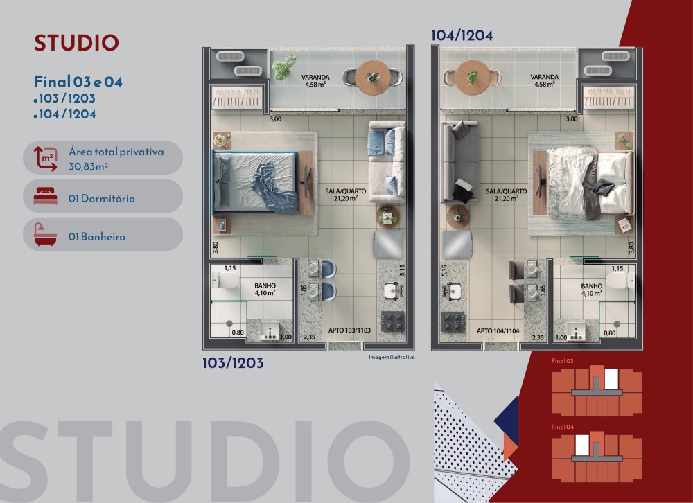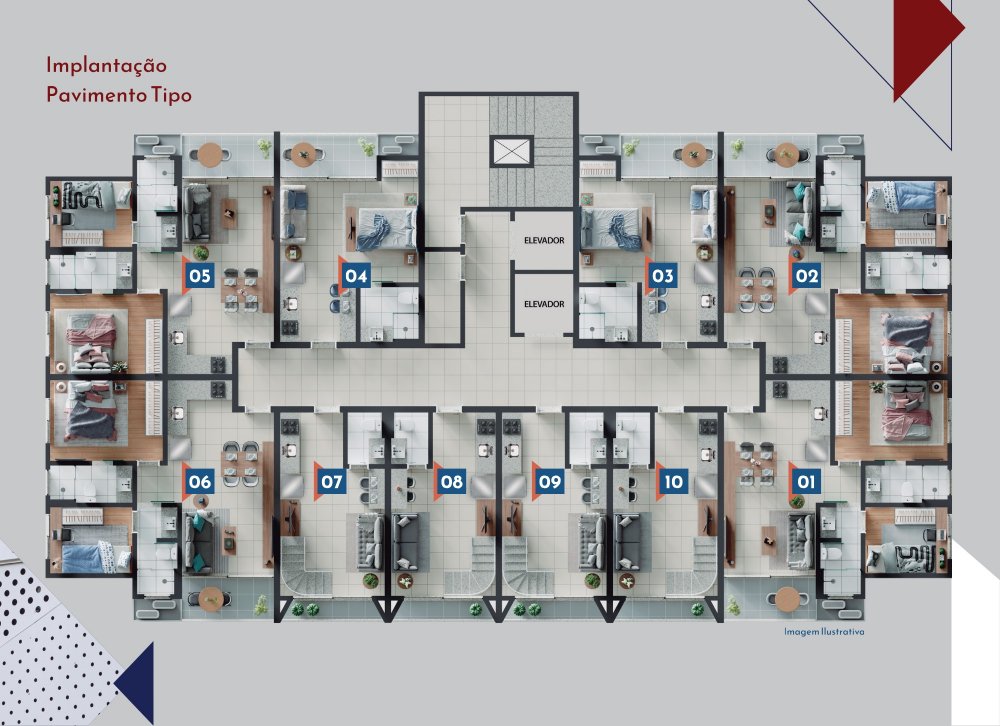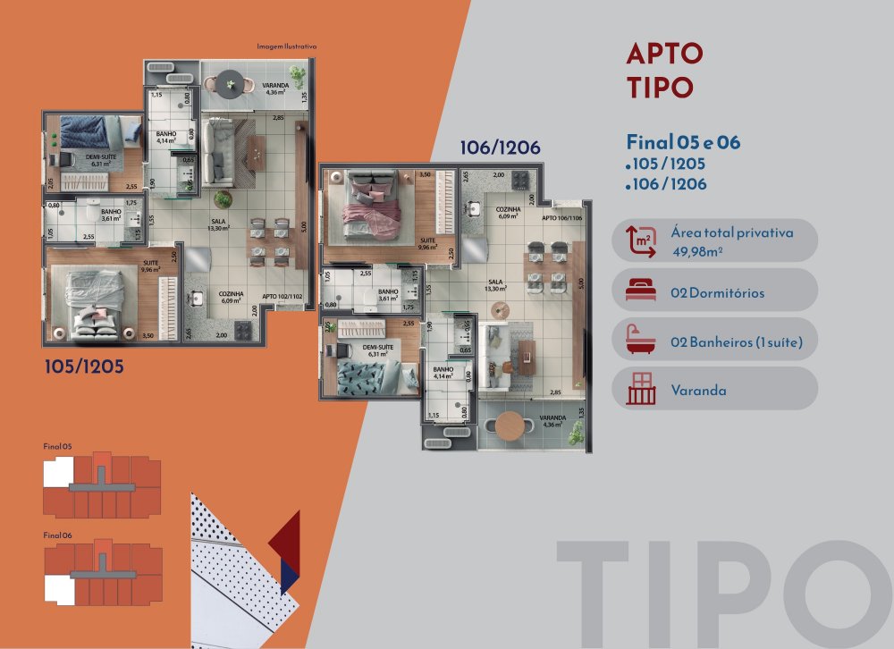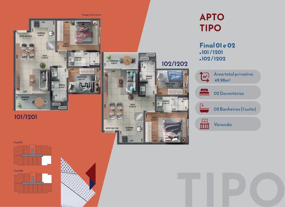 48 Apartamentos tipo de 02 Dorms (sendo 01 suíte) com 50 m²