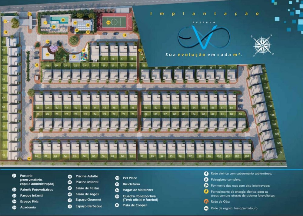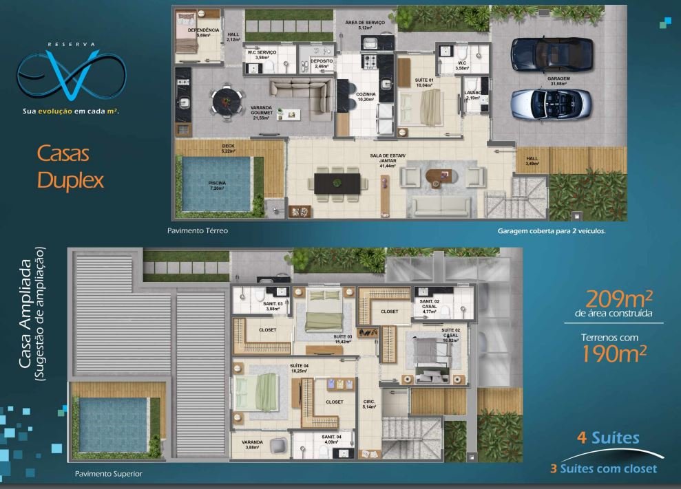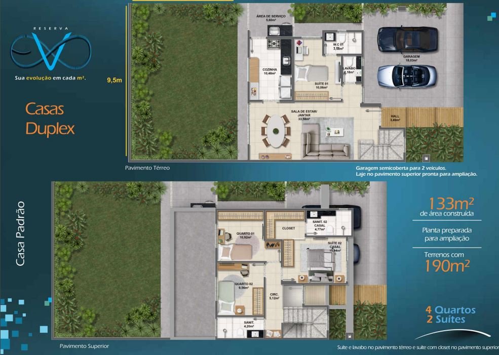 Suíte e Lavabo no pavimento térreo e suíte com closet no pavimento superiorGaragem semicoberta para 2 veículosPavimento superior com laje preparada para ampliaçãoTomadas USB nos quartos, sala e áreas comuns66,5 m² de área para ampliação no lote
